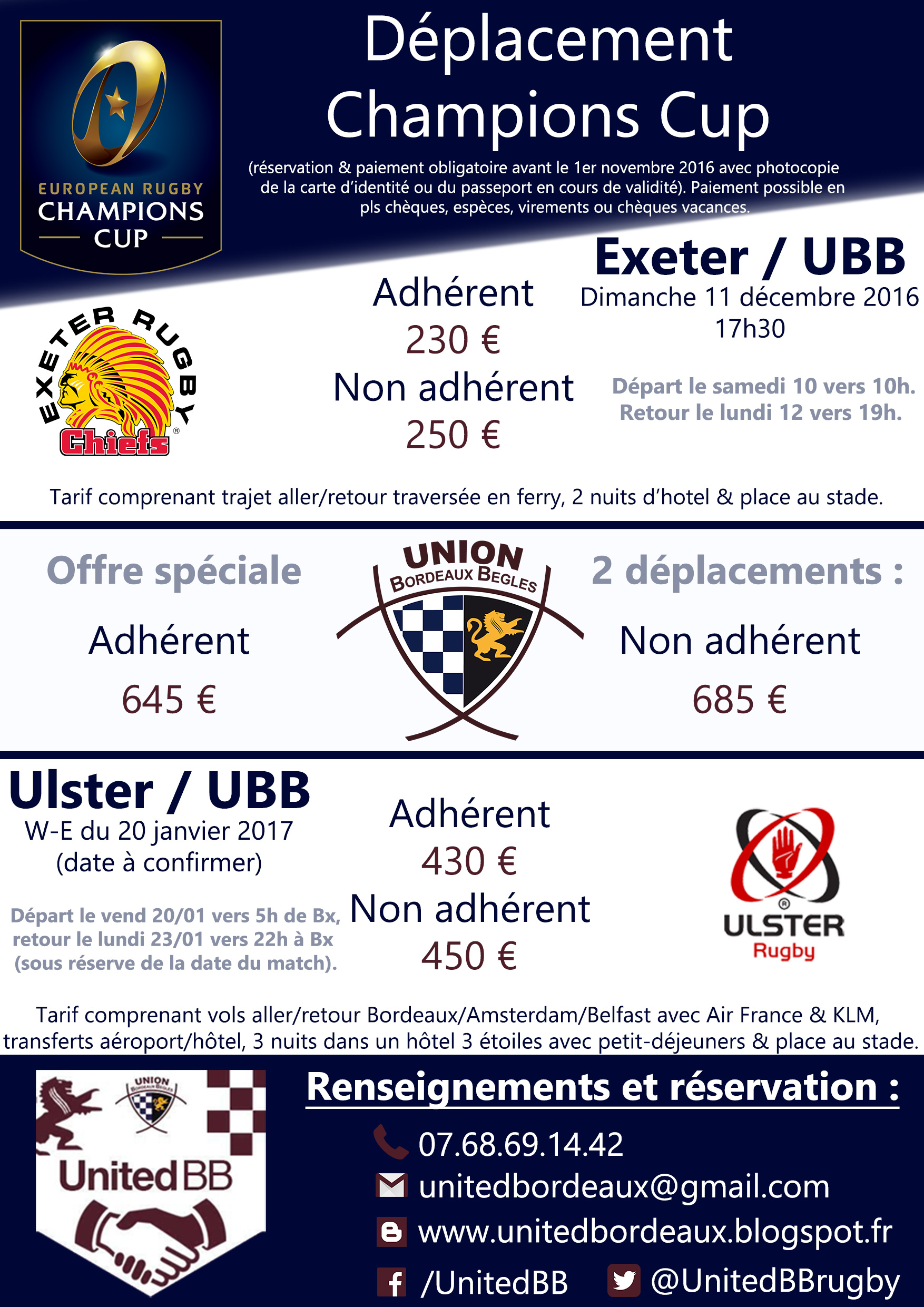 Les United BB organisent les déplacements pour les 3ème et 6ème journées de Champions Cup !