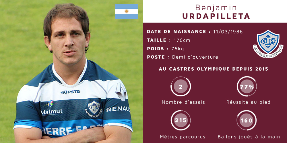 Avec 2 essais à son actif au bout de 8 journées, et un pourcentage de réussite au pied s'élevant à 77% Benjamin Urdapilleta est l'actuel meilleur marqueur et meilleur réalisateur de son équipe pour ce début de saison.