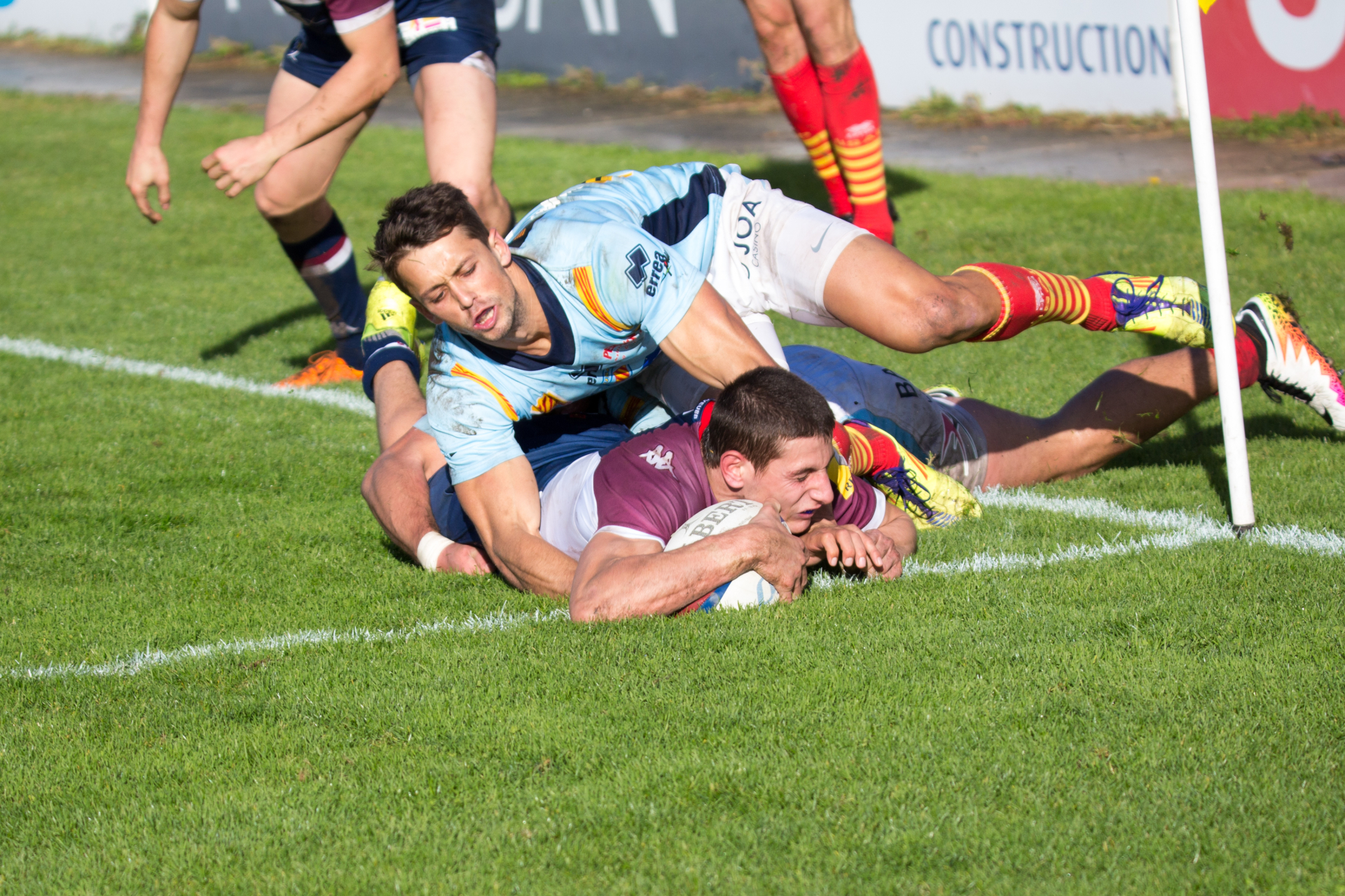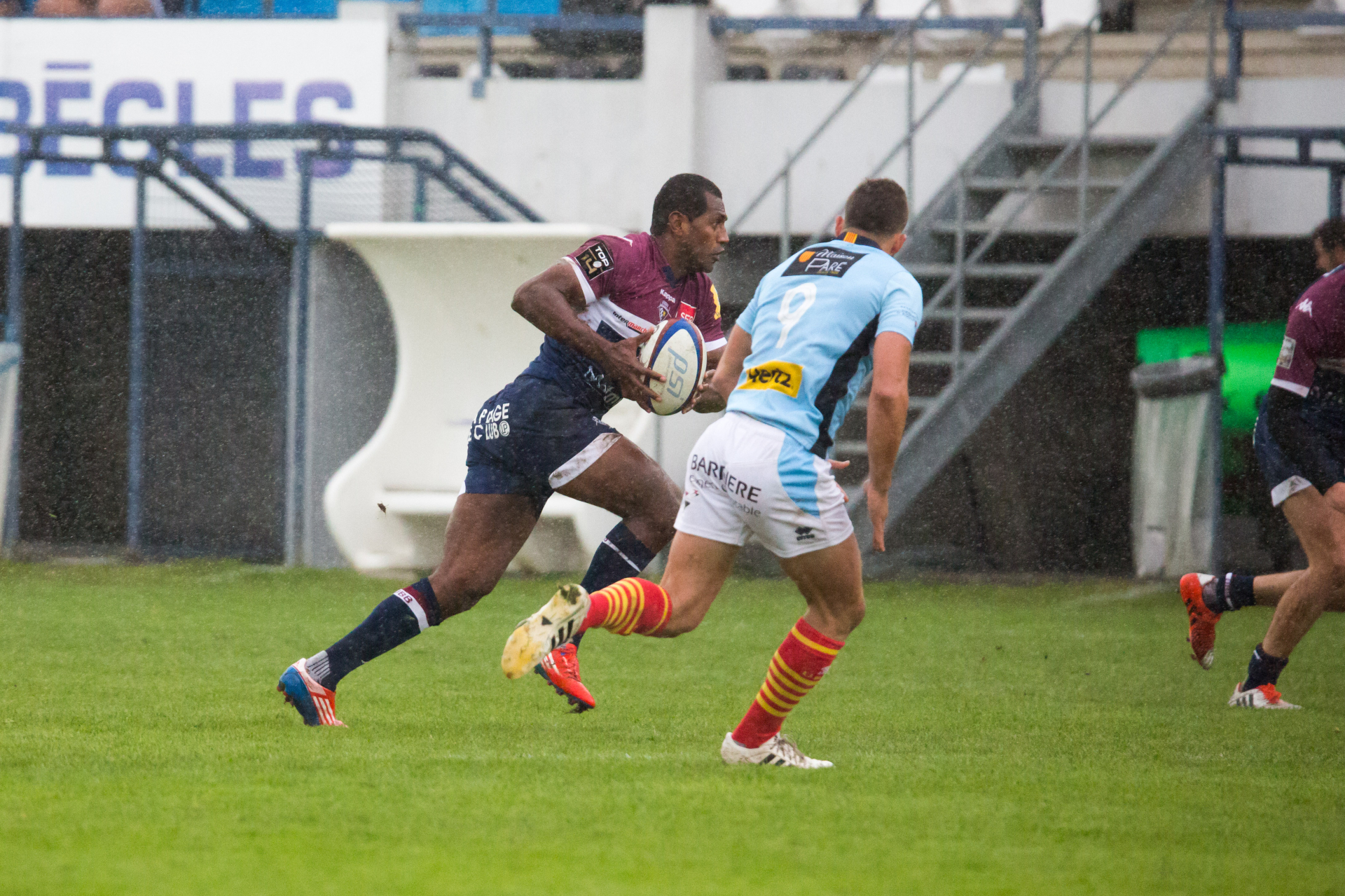 Le jeu reprend avec toujours beaucoup d’intensité, Fréderic Gendre (n°7 de Perpignan) sort sur protocole commotion à la 41’. Nous occupons le camp visiteur, à l’entrée de leur 22m, l'ailier catalan Pierre Lucas intercepte, met les cannes sur 70m, et finit sous nos perches. Nicolas Arlan transforme. USAP 14 UBB 7 à la 44’.