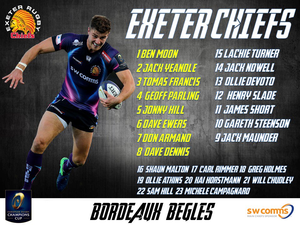 Le staff girondin a procédé à 10 changements par rapport au dernier XV aligné à Toulon pour aller défier Exeter en Champions Cup ce dimanche, coup d'envoi à 17h30 heure locale (18h30 heure française, match à suivre en direct sur Bein Sport 3). L'ouvreur Ian Madigan, de retour de blessure, sera associé à Baptiste Serin à la charnière. On notera également la première titularisation du 3ème ligne Joe Edwards.