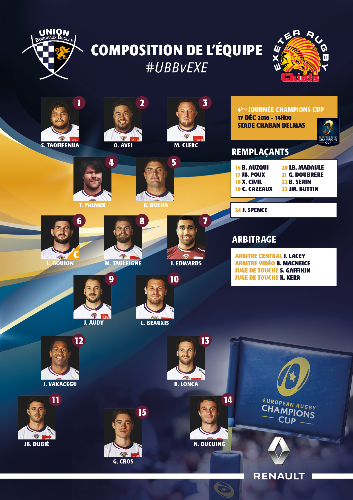 Pour la réception d'Exeter samedi 17 décembre à 14h en Champions Cup, le staff de l'UBB a choisi de procéder à 6 changements par rapport à l'équipe qui s'est imposée dimanche sur la pelouse des Anglais.