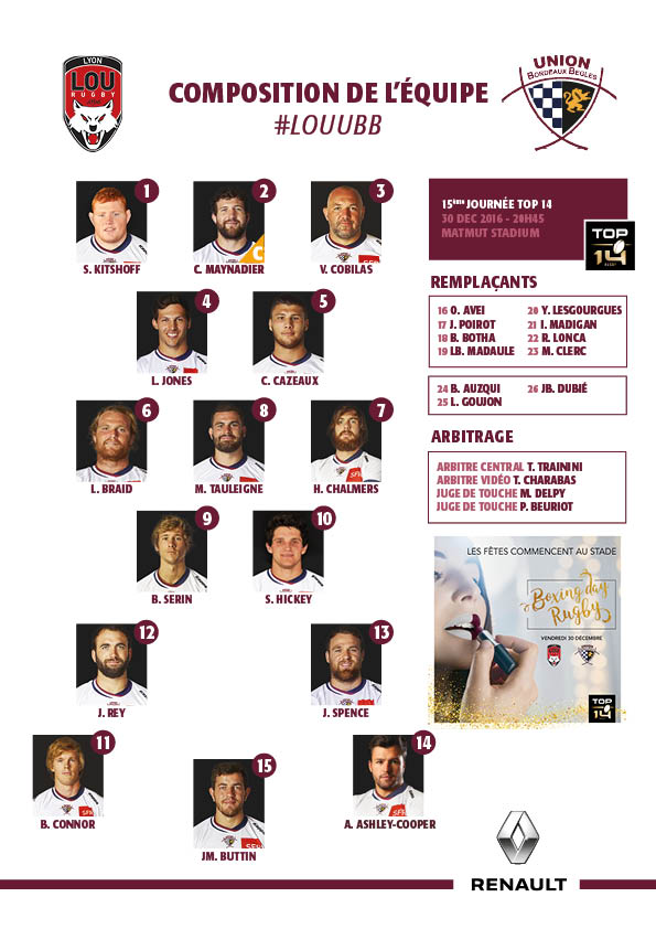 Voici la composition de l'UBB qui affrontera le LOU Rugby en ouverture du Boxing Day Rugby ce vendredi à 20h45 au Matmut Stadium.