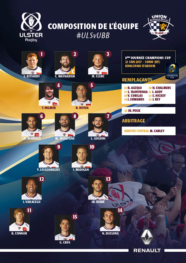 Demain samedi 21 janvier l'UBB ira affronter l'Ulster Rugby à 14h (heure française) pour la 6ème et dernière journée des phases de poule de Champions Cup.