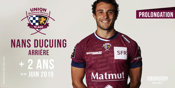 Nous sommes ravis d'annoncer que notre arrière Nans Ducuing, qui poursuit actuellement sa deuxième saison à l'UBB, a prolongé son contrat pour deux saisons supplémentaires au club, soit jusqu'en juin 2019.