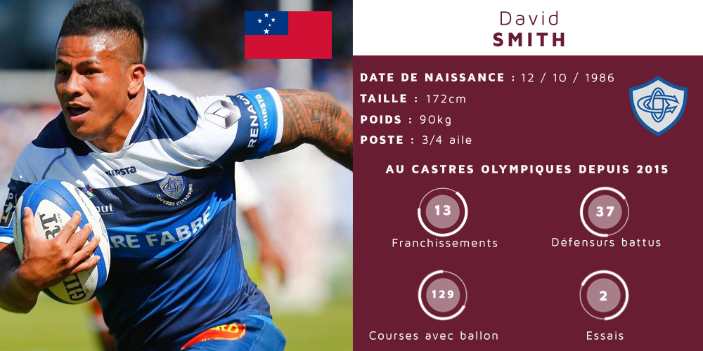 Figure incontournable de notre championnat, David Smith s'est illustré au RC Toulon pendant 4 ans comme un ailier redoutable, avec des appuis de feu et une pointe de vitesse hors norme. Désormais au Castres Olympique depuis la saison 2015-2016, il n'a rien perdu de son explosivité en témoignent les 19 essais déjà inscrits sous le maillot bleu et blanc.