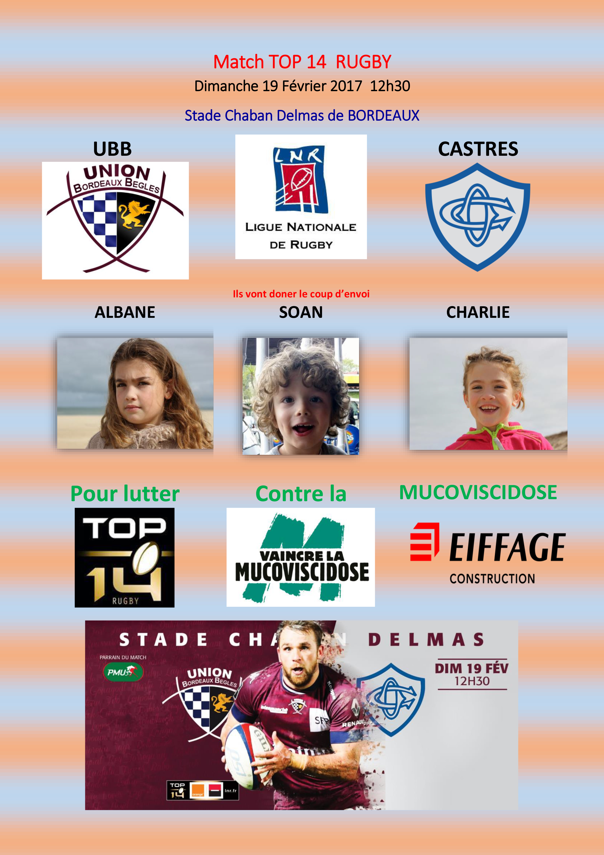 Le coup d'envoi du match face à Castres ce dimanche 19 février à 12h30 sera donné par 3 enfants lors du match face à Castres ce dimanche : Charlie, Albane et Soan, en présence de Laurent Marti, Pierre Guérin, président de l'association Vaincre la Mucoviscidose et Joël Martin, délégué territorial Aquitaine Nord.