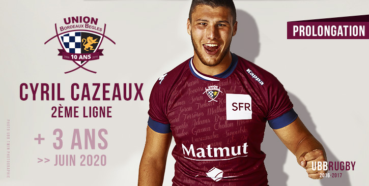 Notre 2ème ligne Cyril Cazeaux vient de signer la prolongation de son contrat pour 3 nouvelles saisons à l'Union Bordeaux Bègles, soit jusqu'en juin 2020. Arrivé chez les Espoirs de l'UBB à l'issue de la saison 2014-2015 en provenance de Dax où il a découvert la PRO D2, Cyril a vite intégré l'effectif professionnel. Sa première cape date du 12 décembre 2015 où il fait coup double en découvrant la Champions Cup (à Swansea face aux Ospreys). A tout juste 22 ans (encore sous contrat espoir jusqu'en 2018) il est devenu un maillon essentiel du pack girondin, totalisant déjà 34 matchs avec l'équipe première... Bravo Cyril !