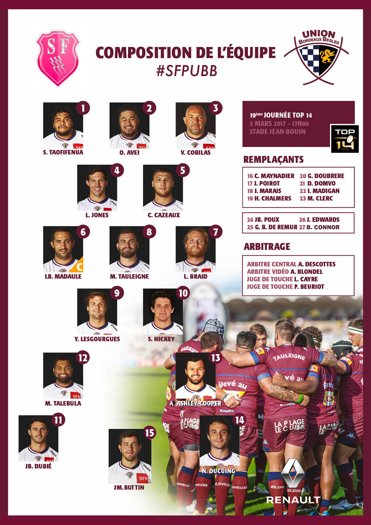 Demain dimanche 5 mars à 17h, l'UBB affrontera le Stade Français Paris au stade Jean Bouin.