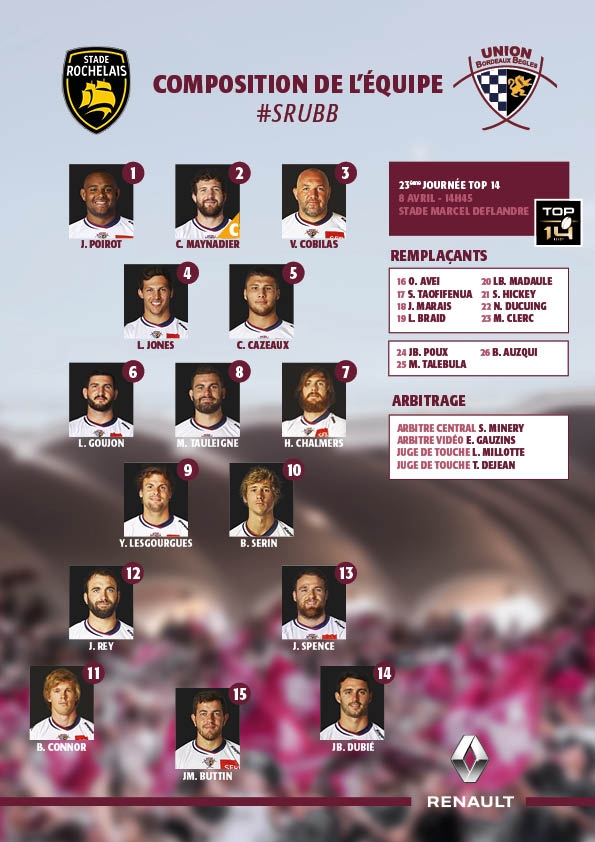 Ce samedi 8 avril à 14h45, l'UBB défie le leader du Top 14, le Stade Rochelais, dans son chaudron de Marcel Deflandre encore inviolé cette saison. Un énorme défi attend les hommes du capitaine Maynadier pour ce nouveau derby de l'Atlantique ! Invaincus depuis 13 matchs toutes compétitions confondues, les jaunes et noirs de Patrice Collazo attendent les Girondins de pieds fermes, ayant gardé en mémoire le match aller à Chaban... où les Rochelais sont tombés pour la dernière fois. Voici la composition de l'équipe !