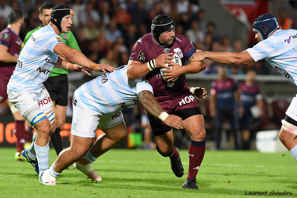 Dans une ambiance estivale au stade Chaban Delmas, devant 23 000 supporters, la première journée de championnat de cette saison 2016-2017 démarre sur les chapeaux de roues : nos joueurs accueillent les champions de France en titre. Dès le début de la rencontre l'UBB met la pression sur la défense du Racing. Nos avants pilonnent la ligne de défense francilienne. Malgré une grosse charge de Romain Taofifenua, il n’y aura pas d’essai mais Ian Madigan passe tout de même une pénalité : 3-0. Premier avertissement sans frais pour nos joueurs à la 15’ suite à un bon coup de pied à suivre de Brice Dulin. Le score n’évolue pas avant la fin de première période, où Ian Madigan et Dan Carter se rendent coup pour coup en inscrivant 3 points chacun. Score à la mi-temps : 6-3.