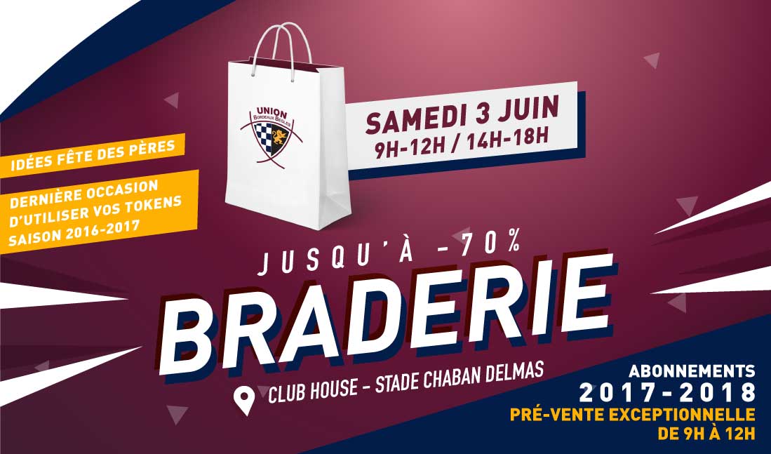 La braderie annuelle de la boutique UBB aura lieu ce samedi 3 juin, au stade Chaban Delmas. Pensez-y pour vos cadeaux de Fête des Pères !