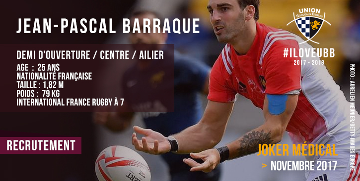 L'arrière polyvalent Jean-Pascal Barraque (25 ans), international de rugby à 7, vient renforcer l'UBB en tant que joker médical de Romain Lonca (rupture du ligament croisé en mars dernier). Nous lui souhaitons la bienvenue à l'UBB !