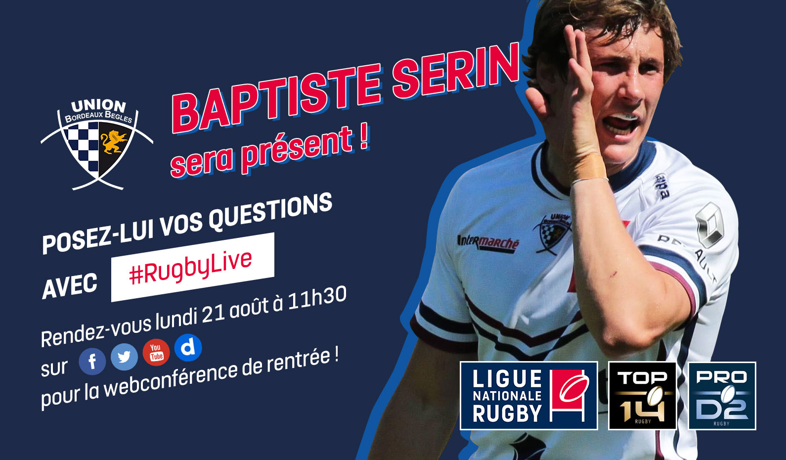 A cinq jours de la reprise du Top 14, la Ligue Nationale de Rugby organise lundi 21 août à 11h30 une web conférence avec la participation d'un joueur par club. Baptiste Serin représentera l'UBB, posez-lui vos questions toutes vos question via le hashtag #Rugbylive sur les réseaux sociaux, ou directement via la page Facebook officielle Top 14.