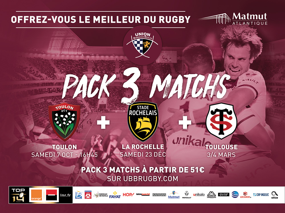 L'UBB lance le pack 3 matchs ! Profitez pleinement des 3 matchs de gala délocalisés au Matmut Atlantique, face au RC Toulon, le Stade Rochelais et le Stade Toulousain !