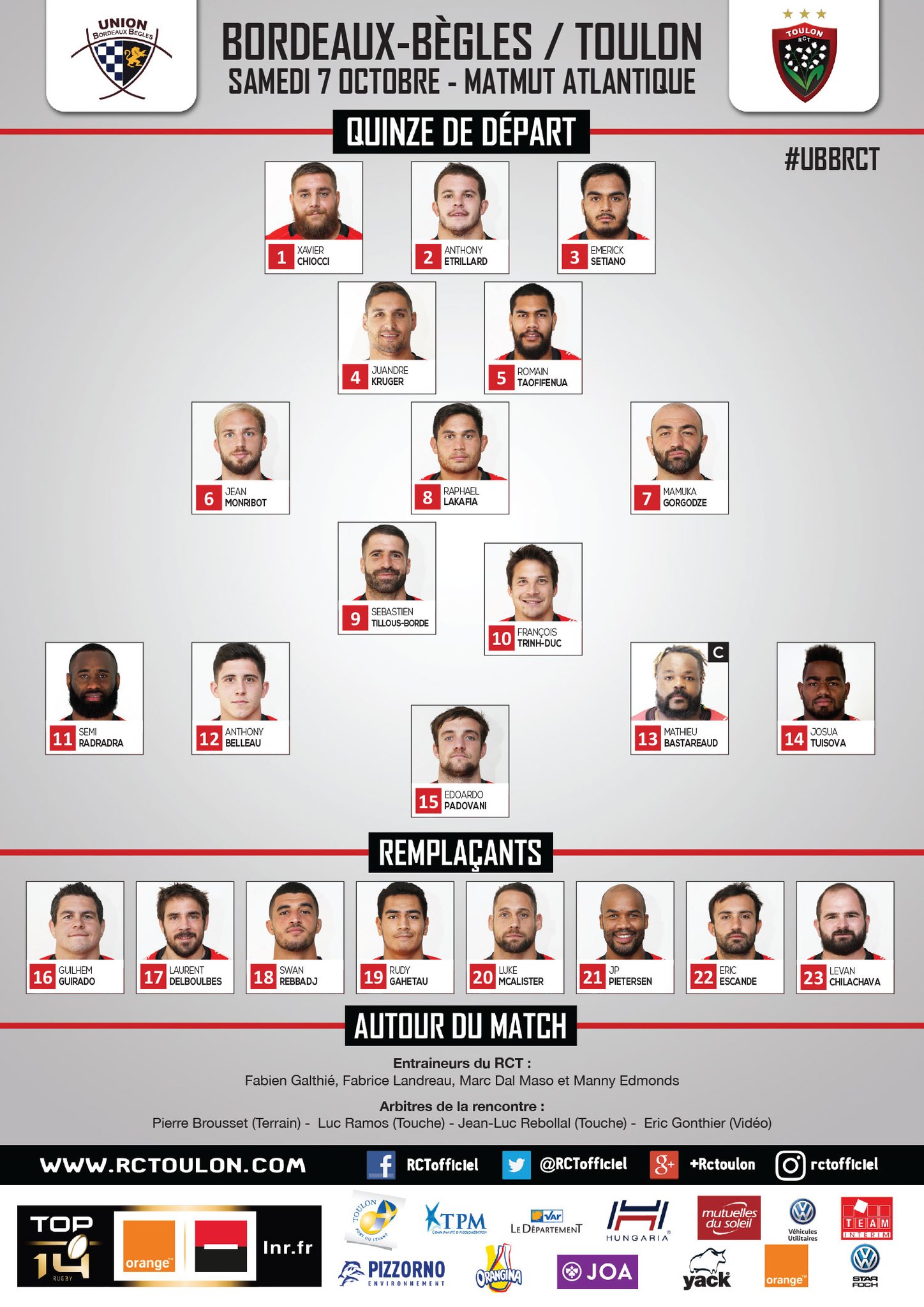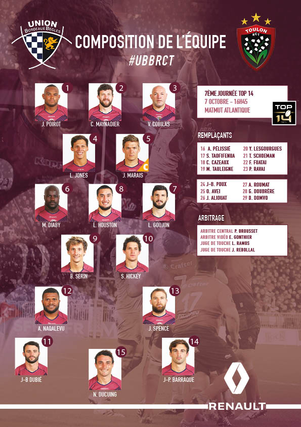 Ce samedi 7 octobre aura lieu le premier match de gala délocalisé au Matmut Atlantique : UBB - RC Toulon, coup d'envoi à 16h45. Voici la composition des équipes...