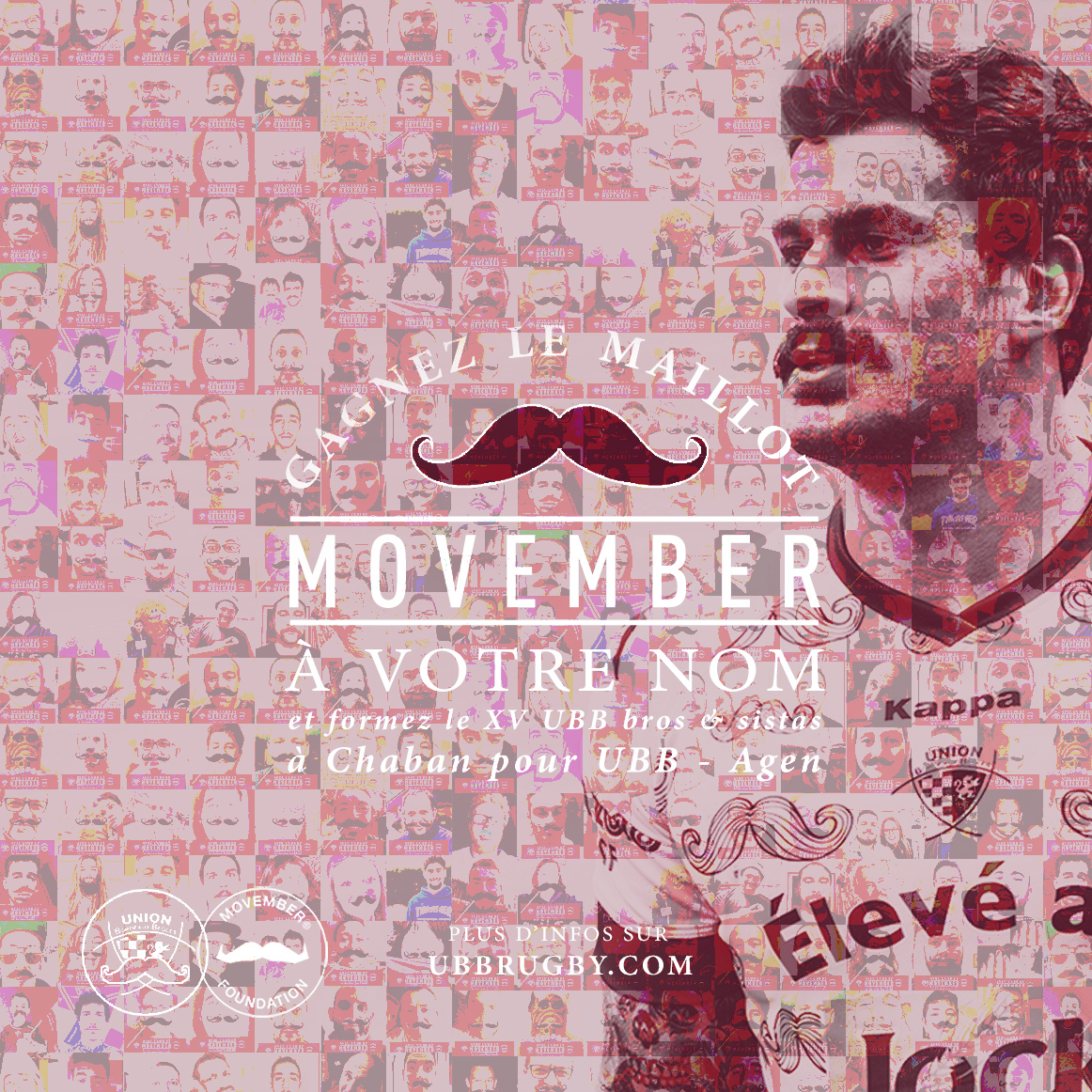 Pour l'édition 2017 de Movember, l’Union Bordeaux-Bègles a lancé un jeu concours afin de vous faire gagner le maillot officiel Kappa "UBB - Movember" personnalisé à votre nom. Jusqu’au 11 novembre à midi, participez et montrez votre attachement au combat contre les maladies masculines...