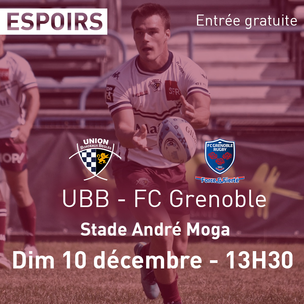 Après avoir essuyé deux revers consécutifs, les espoirs de l'UBB (3ème) tenteront de réagir sur leur pelouse de Moga face à Grenoble (6ème) pour conserver leur place sur le podium. Coup d'envoi ce dimanche 10 décembre à 13h30, venez nombreux l'entrée est gratuite pour tous !