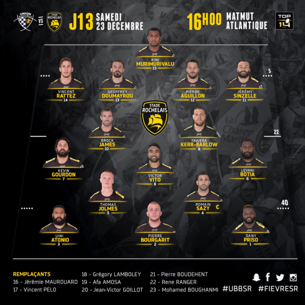 Plus de 37 000 supporters sont attendus au Matmut Atlantique ce samedi 23 décembre pour le choc de la 13ème journée entre l'Union Bordeaux Bègles et le Stade Rochelais, leader du Top 14. Voici la composition de l'UBB.
