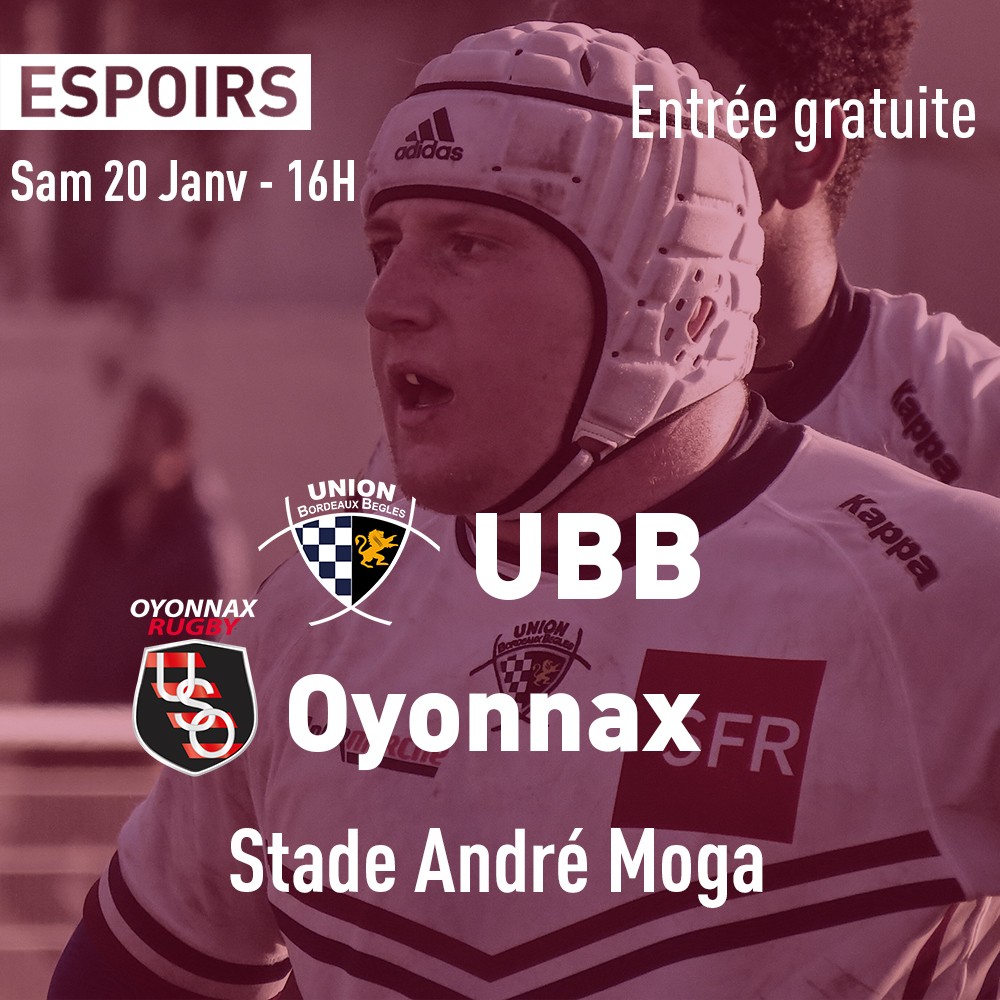 Prochain rendez-vous à domicile au stade André Moga, les jeunes de l'UBB reçoivent Oyonnax, actuel 6ème du championnat. Venez les encourager lors de cette rencontre ce samedi à 16h ! L'entrée est gratuite.