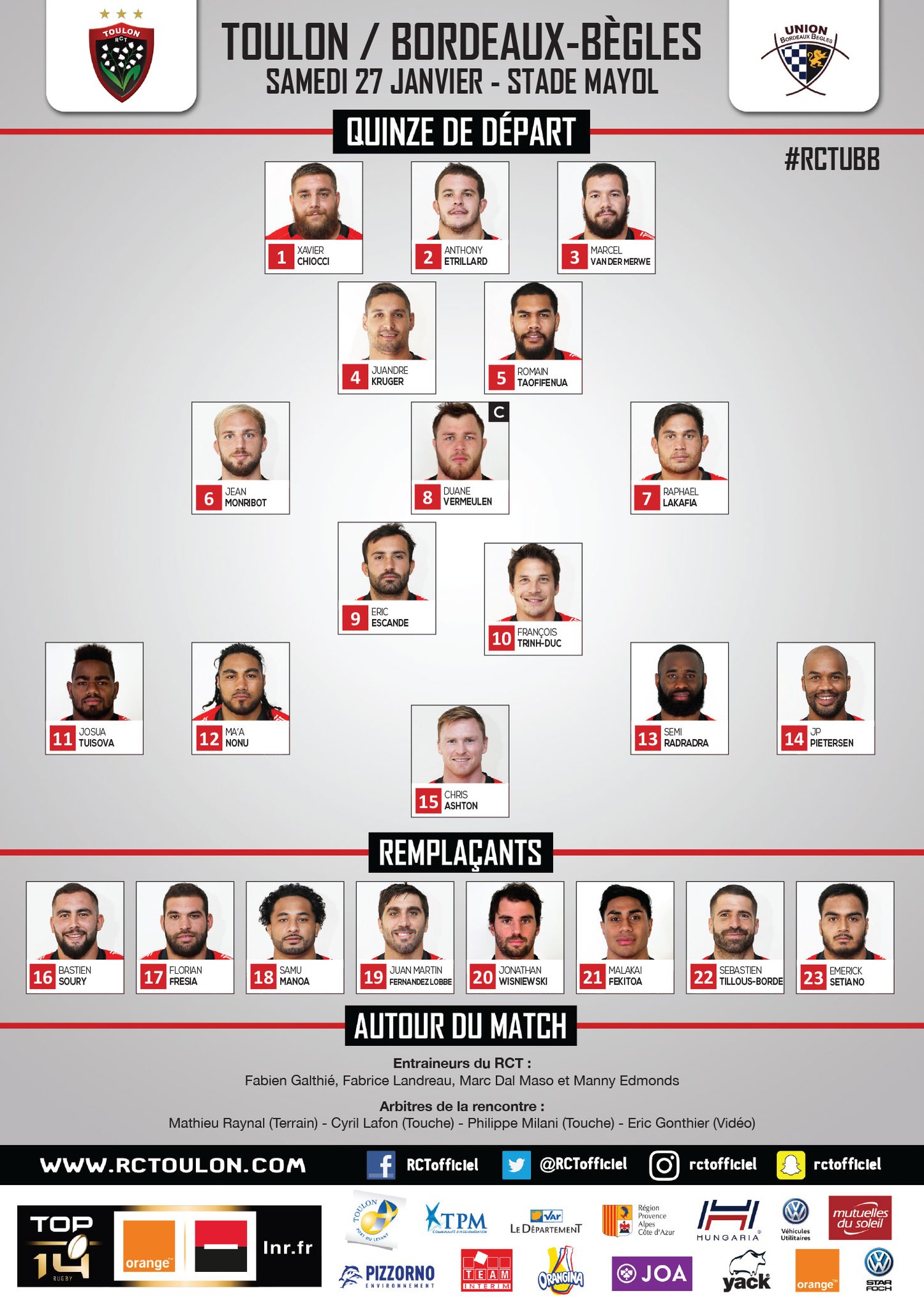 Ce match comptant pour la 16ème journée du Top 14 opposera les Toulonnais, 5èmes au classement aux Girondins qui pointent à la 8ème place, à 1 point de leur adversaire du jour. L'UBB ne s'est jamais imposée sur la rade, réussira-t-elle à créer l'exploit demain ?