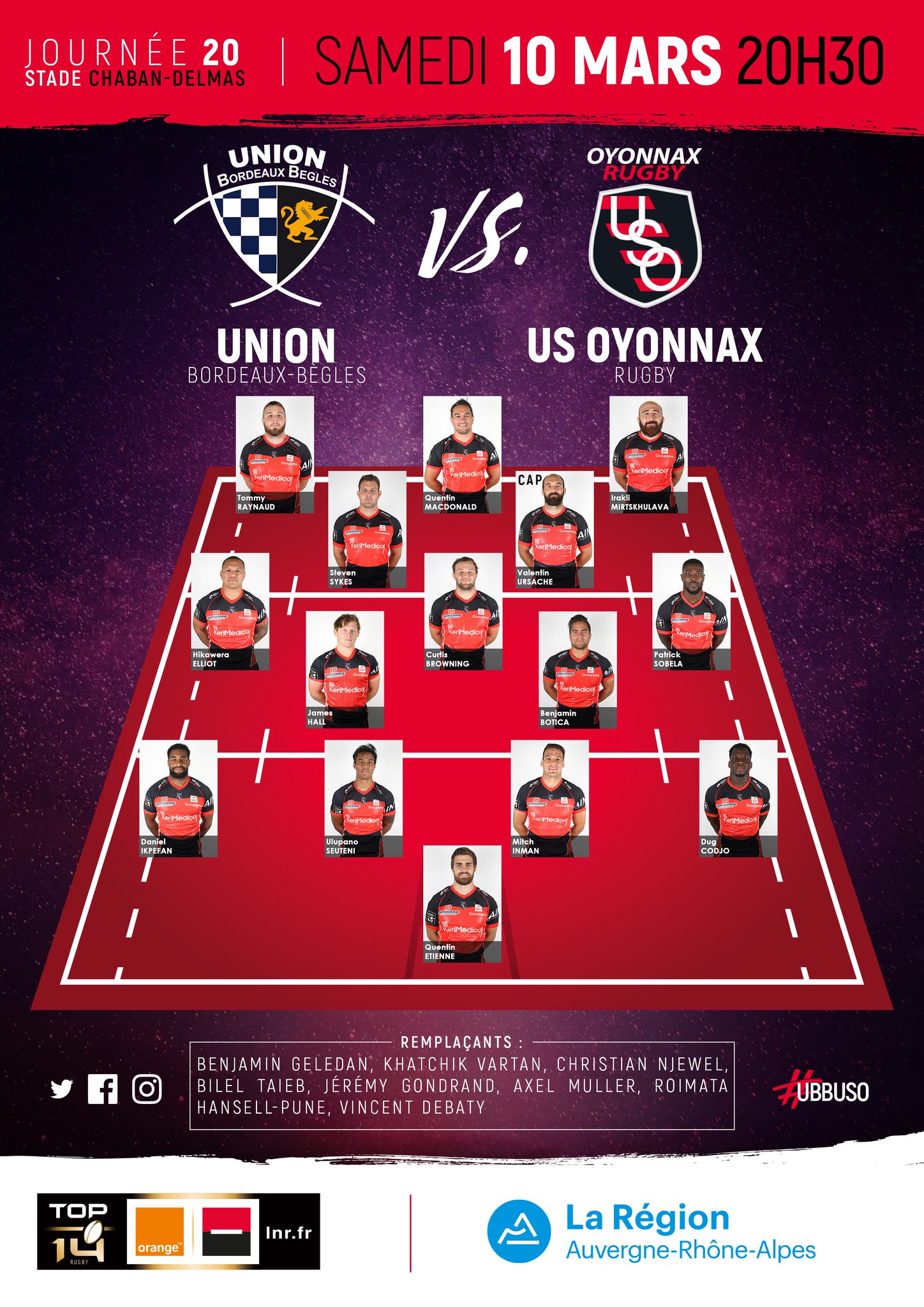 Bien que toujours lanterne rouge du Top 14, l'US Oyonnax reste sur deux victoires consécutives après avoir battu Clermont au stade Michelin et le Stade Français à domicile. Les coéquipiers de Daniel Ikpefan, auteur 5 essais lors de ses 7 derniers matchs, et de l'ouvreur Ben Botica, meilleur réalisateur du Top 14 avec 225 points à son actif, les hommes d'Adrien Buononato nous promettent une rude partie pour le retour de l'UBB à Chaban...