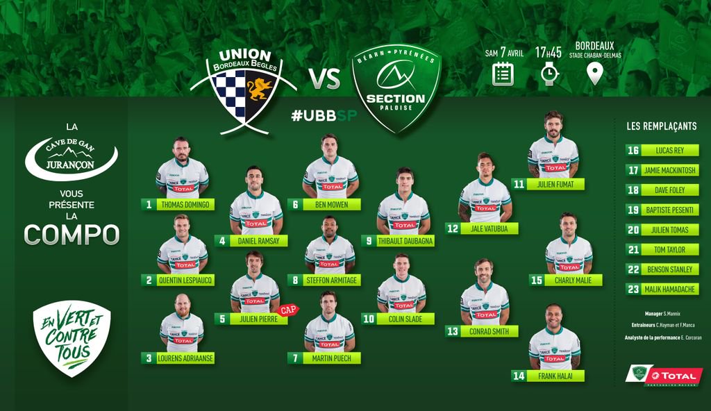 Ce samedi 7 avril à 17h45, l'Union Bordeaux Bègles défie la Section Paloise, actuellement 6ème au classement, pour le dernier derby à Chaban.