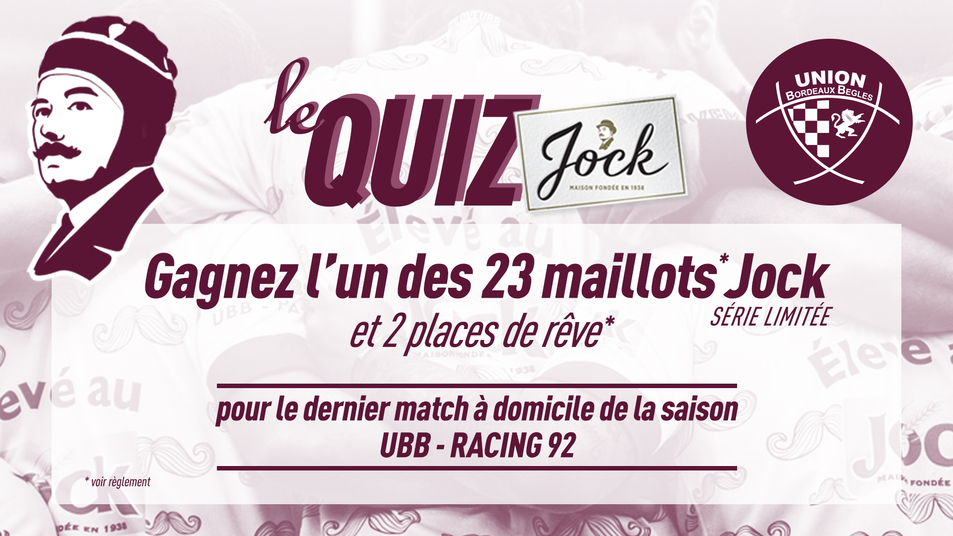 Chrono-quiz : 7 jours de jeu, 7 questions en 7 secondes ! À l'occasion du parrainage par Jock du dernier match à domicile de la saison face au Racing 92 dimanche 29 avril à 12h30, l'Union Bordeaux Bègles vous fait gagner les 23 maillots d'échauffement "Élevé au Jock" !