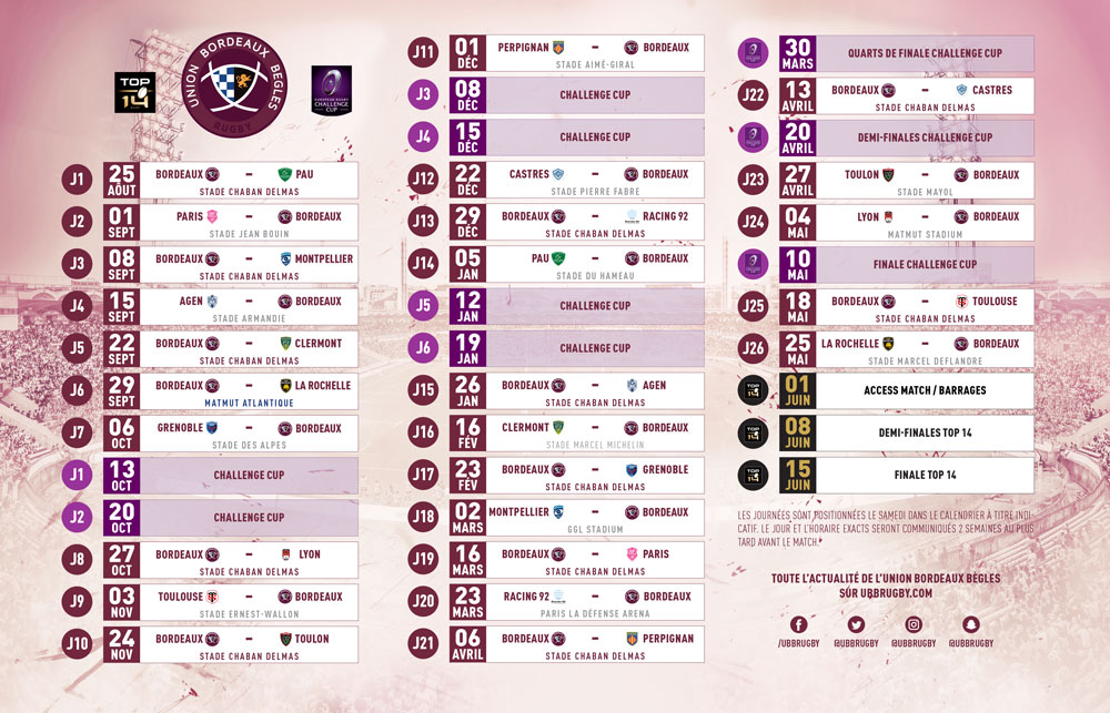L'UBB accueillera la Section Paloise la première journée à Chaban, le 25 août. Les hommes de Rory Teague iront défier le Stade Français pour le premier déplacement de la saison, et accueilleront Montpellier à Chaban 7 jours plus tard.