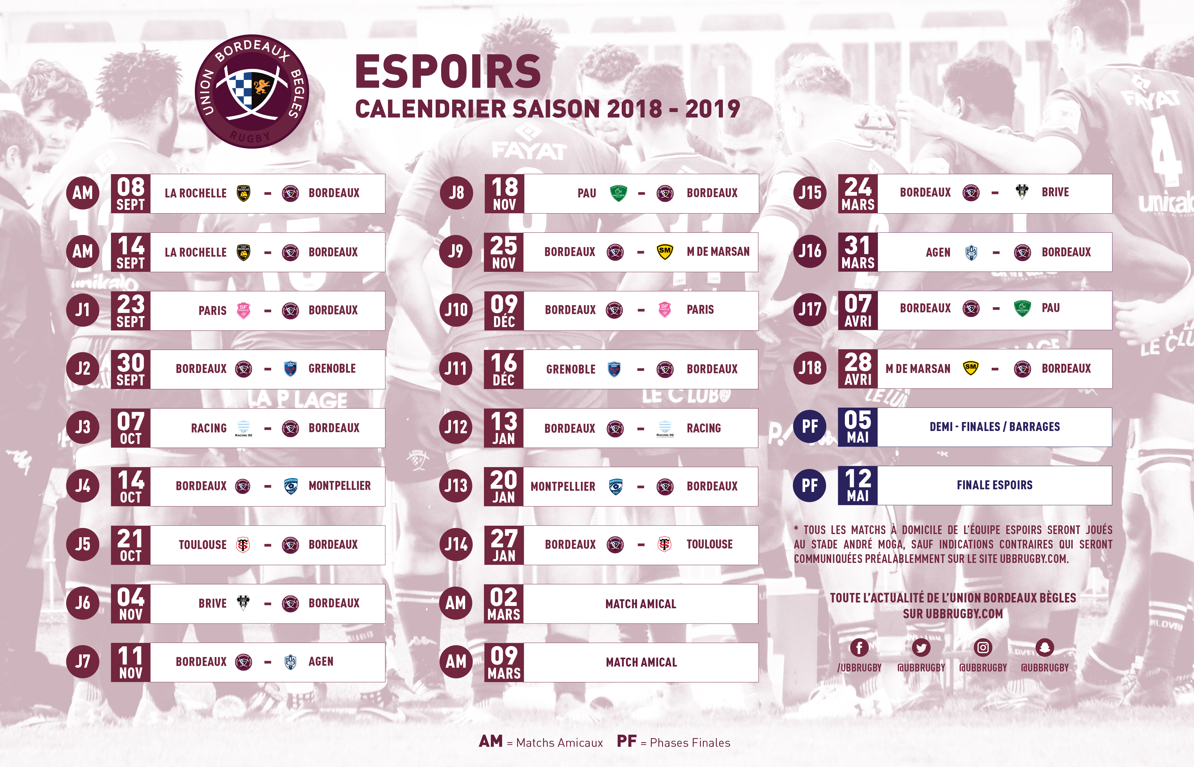 CALENDRIER UBB ESPOIRS 2018 - 2019 :