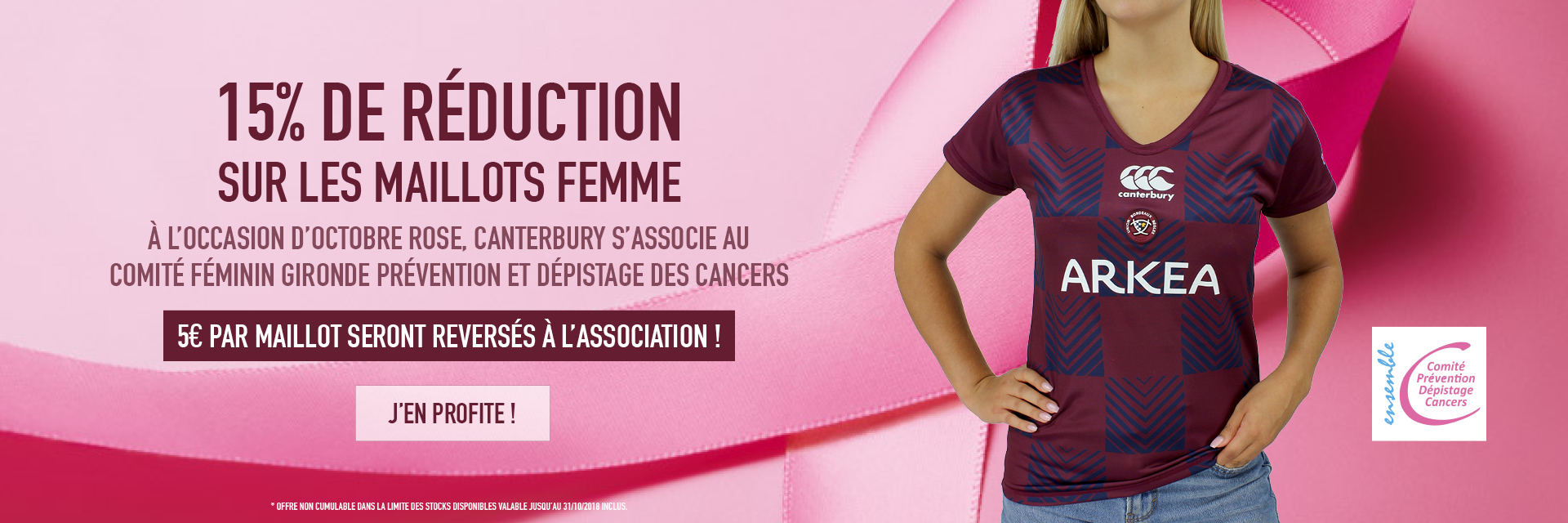 Enfin, l'équipentier officiel de l'UBB, Canterbury, propose une offre exceptionnelle à destination des femmes, avec une remise de 15 % sur le modèle femme du maillot réplica, quelque soit la couleur. Pour chacune des ventes, 5€ seront reversés à l’association Comité Prévention Dépistage Cancer. Retrouvez l’offre sur la boutique en ligne et dans les boutiques du stade les jours de matchs UBB / Perpignan (20 octobre) et UBB / Lyon (27 octobre).