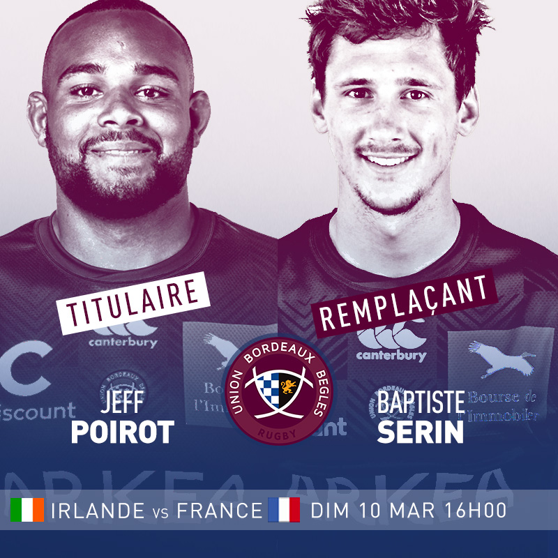 Les deux joueurs de l'UBB Jefferson Poirot et Baptiste Serin figurent sur la feuille de match des Bleus. Notre pilier sera titulaire tandis que Baptiste débutera sur le banc. Allez les Bleus !