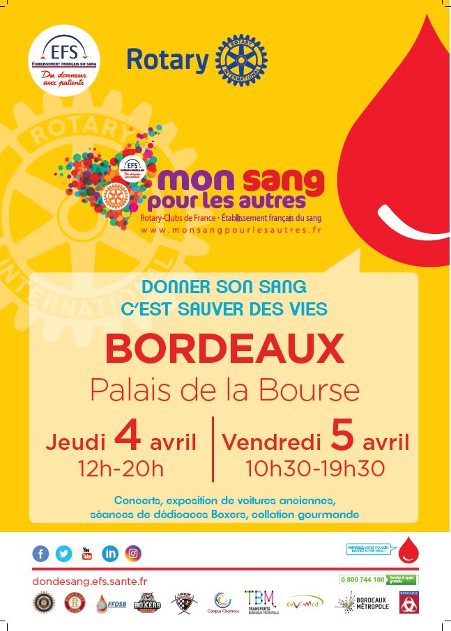 Le Rotary club de France, l’Association Mon sang Pour Les Autres et l’Etablissement Français du Sang (EFS), organisent l’opération "Mon sang pour les autres" jeudi 4 avril de 12h à 20h, et vendredi 5 avril de 10h30 à 19h30, au Palais de la Bourse à Bordeaux. L'Union Bordeaux Bègles est heureuse de d'associer à cet événement.