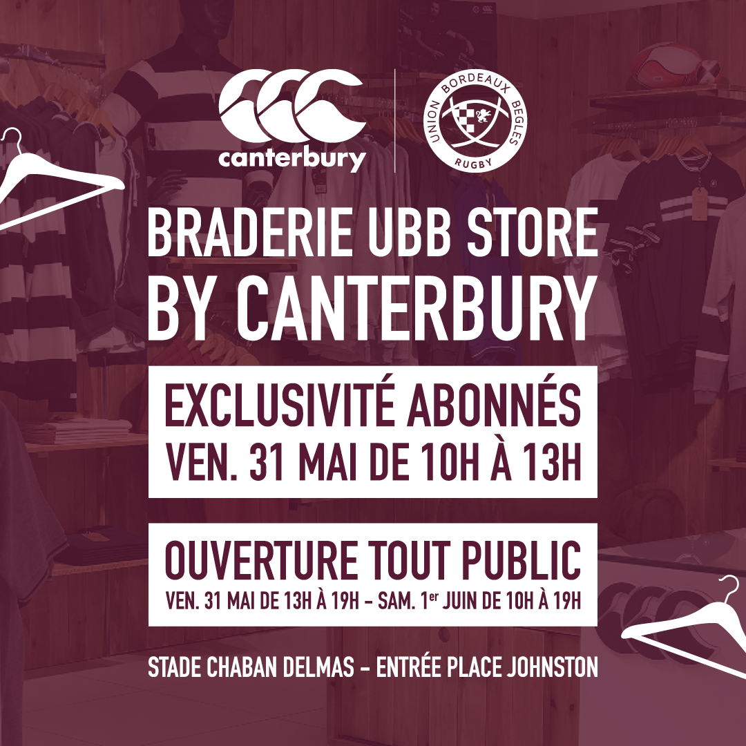 L'UBB et Canterbury vous invite à la braderie annuelle de fin de saison vendredi 31 mai et samedi 1er juin au stade Chaban Delmas.