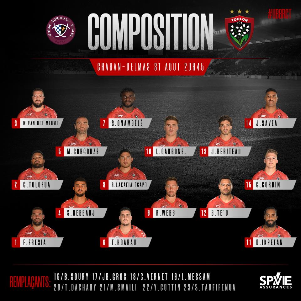 2ème journée du Top 14 ! Découvrez la composition d'équipe qui sera alignée par Christophe Urios samedi à 20h45 à Chaban pour la réception du RC Toulon.