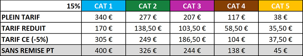 -50% par rapport au plein tarif (hors catégorie 5) : jeunes nés après le 1er janvier 2002, étudiants avec une carte étudiante 2019/2020, personnes possédant une carte d’invalidité / priorité d’au moins 50%. Une pièce justificative sera demandée à l'entrée du stade à chaque match. Sans celle-ci, l'entrée pourra être refusée.