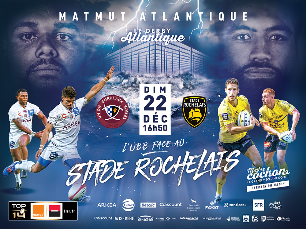 Rendez-vous dimanche 22 décembre à 16h50 au Matmut Atlantique pour soutenir l'UBB contre La Rochelle lors du Derby Atlantique !