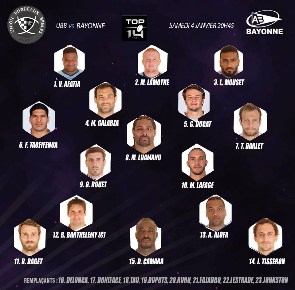 Christophe Urios et son staff ont dévoilé la composition d'équipe retenue pour la réception de l'Aviron Bayonnais samedi à 20h45 à Chaban dans le cadre de la 13e journée de Top 14.