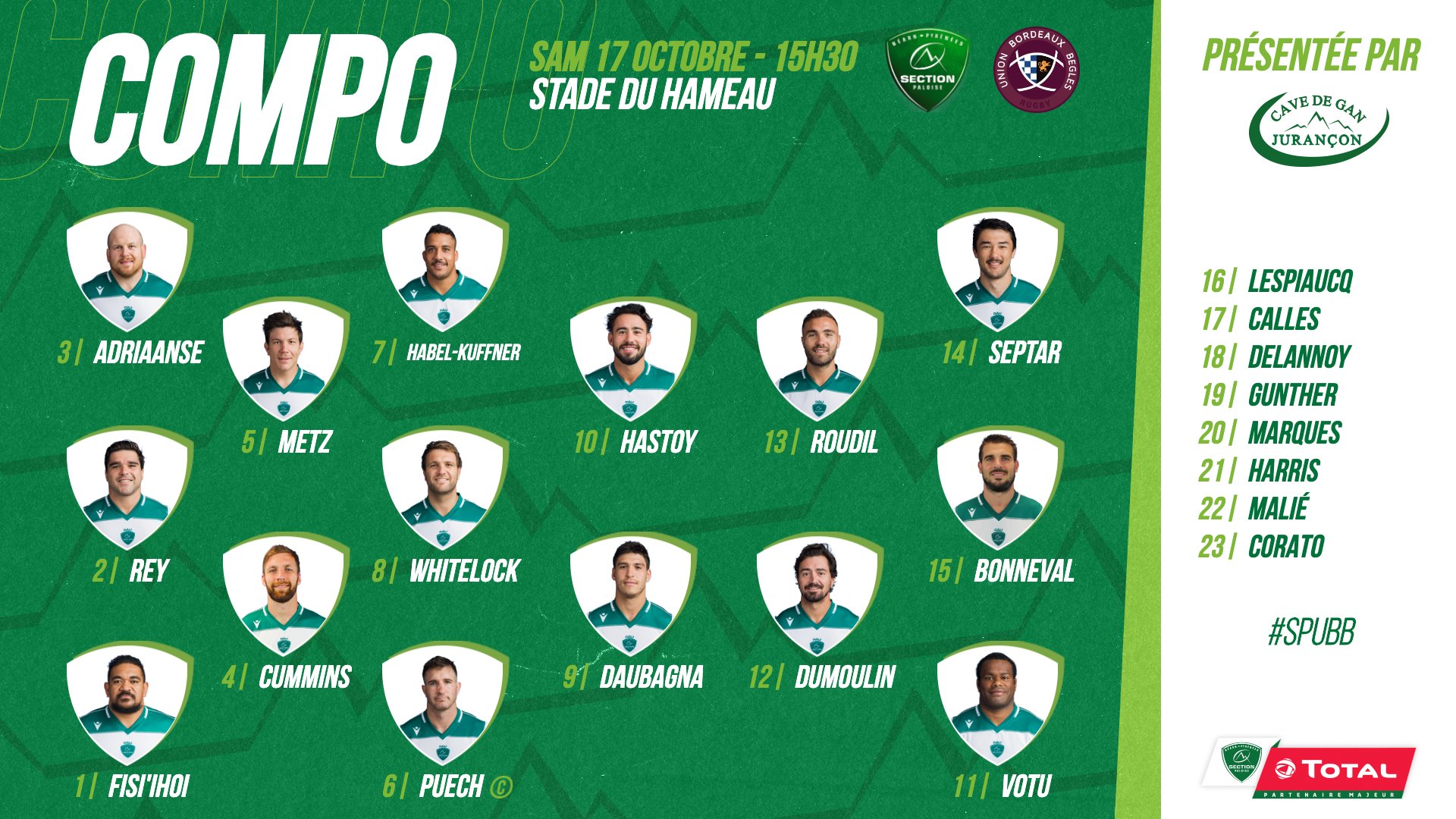Voici la composition d'équipe retenue pour aller défier la Section Paloise, samedi 17 octobre 2020 à 15h30 au Hameau, lors de la 5e journée de Top 14.