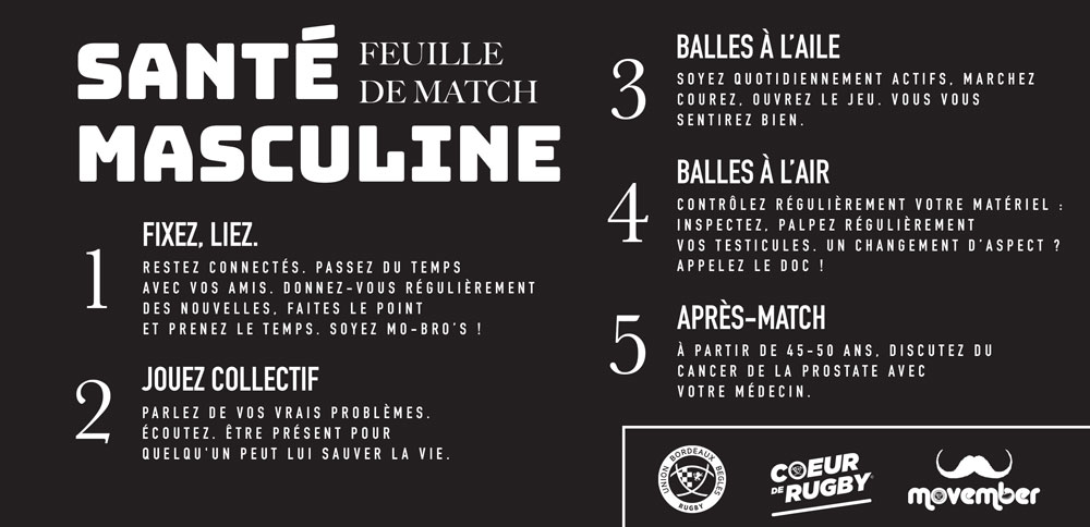 Comme chaque année depuis 7 saisons, l'UBB soutient le mouvement Movember, qui s'attache chaque mois de novembre à sensibiliser et combattre les maladies masculines parmi lesquelles le cancer de le prostate et le cancer des testicules, ainsi que les problèmes de santé mentale.