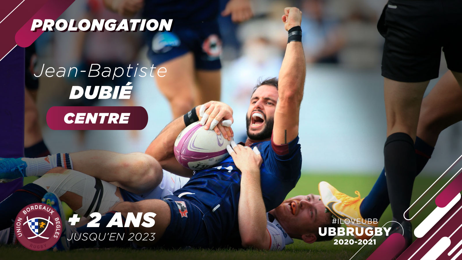 Notre trois-quart centre Jean-Baptiste Dubié, présent à l'UBB depuis 2015, prolonge pour deux saisons supplémentaires, soit jusqu'en 2023. Alors qu'il effectue sa 6e saison au club, Jean-Baptiste a porté le maillot Bordeaux & Blanc à 92 reprises pour 12 essais inscrits.