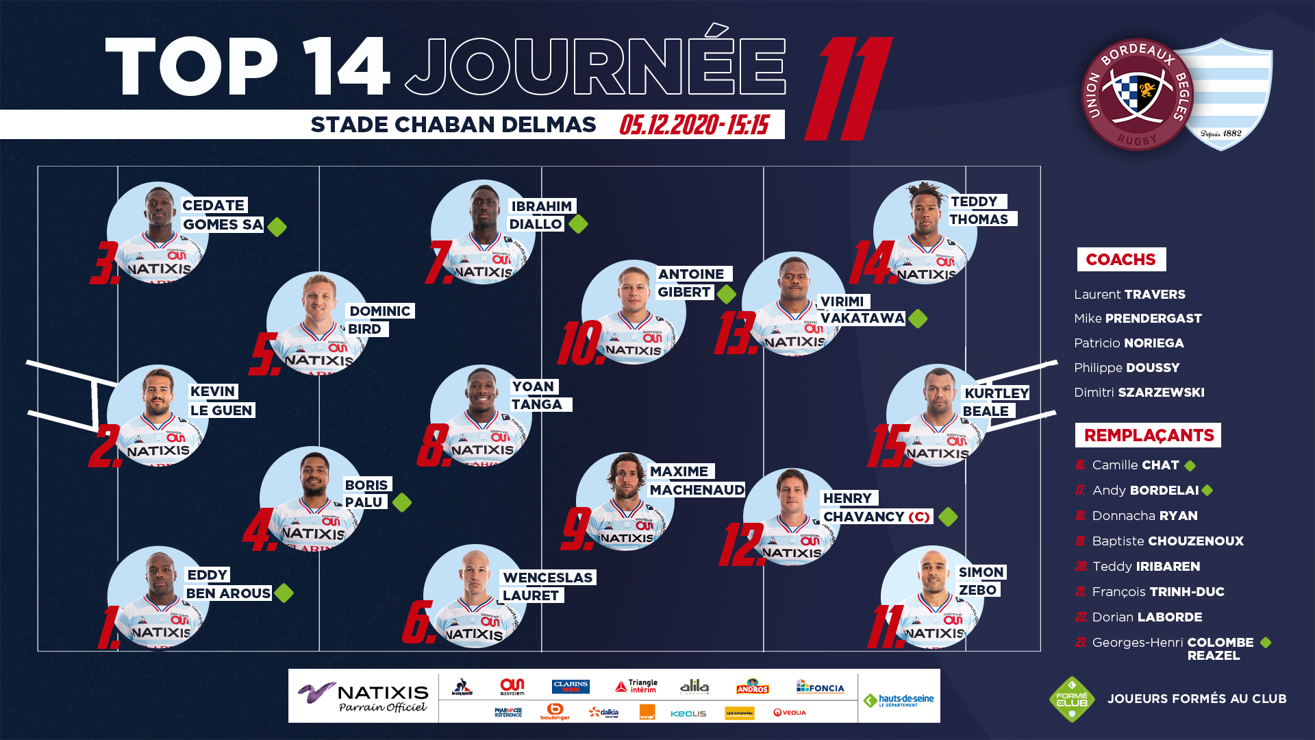 Christophe Urios et son staff ont dévoilé la composition d'équipe pour affronter le Racing 92, ce samedi 5 décembre à 15h15 à Chaban, lors de la 11e journée de Top 14.