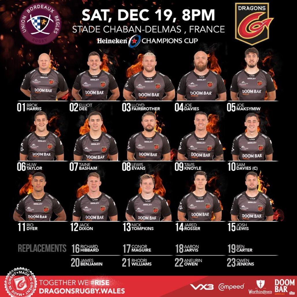 Christophe Urios et son staff ont dévoilé la composition d'équipe retenue pour affronter les Newport Dragons lors de la 2e journée de Champions Cup, ce samedi 19 décembre 2020 à 21h à Chaban.