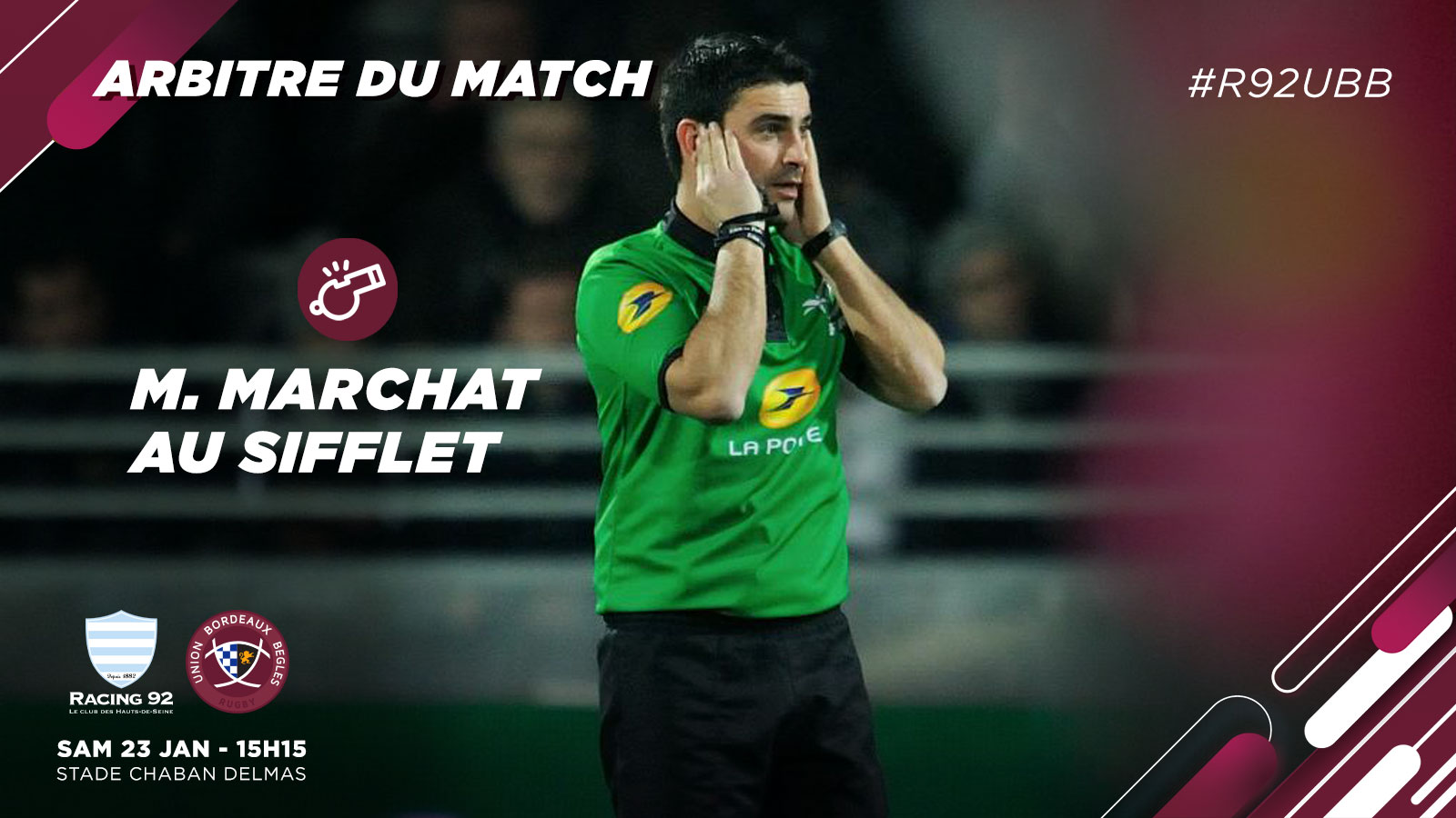 La Ligue Nationale de Rugby a nommé M. Marchat pour arbitrer le match Racing 92 - UBB, ce samedi 23 janvier à 15h15 à Paris La Défense Arena, pour la 19e journée de Top 14.