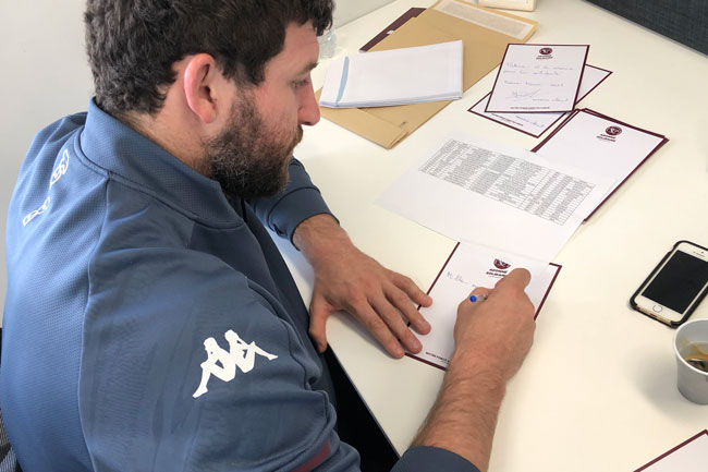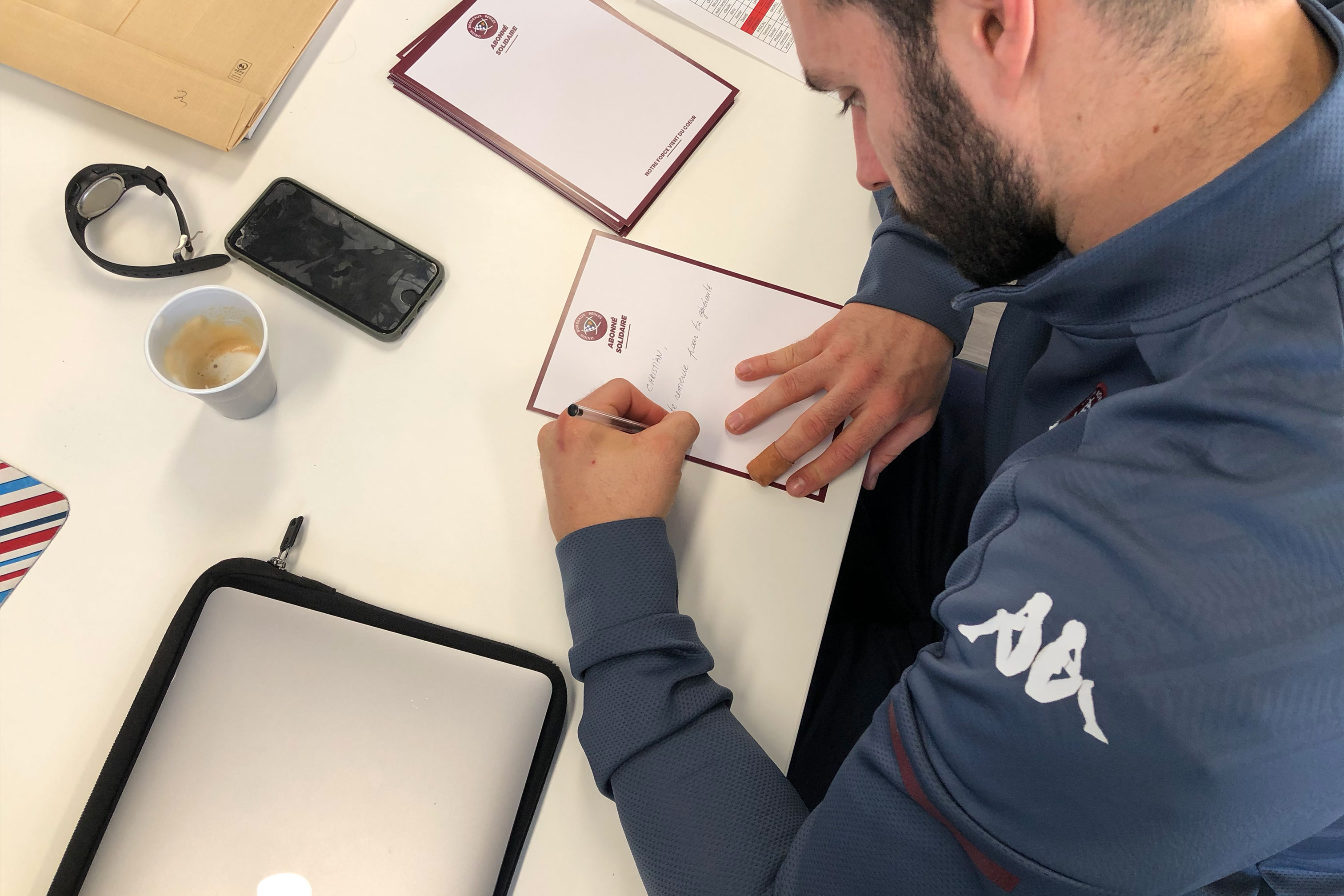 Depuis quelques jours, les joueurs écrivent des cartes de remerciements pour les envoyer à nos milliers d'abonnés qui, en ne demandant pas le remboursement des matchs joués à huis-clos, ont choisi d'être solidaires du club.