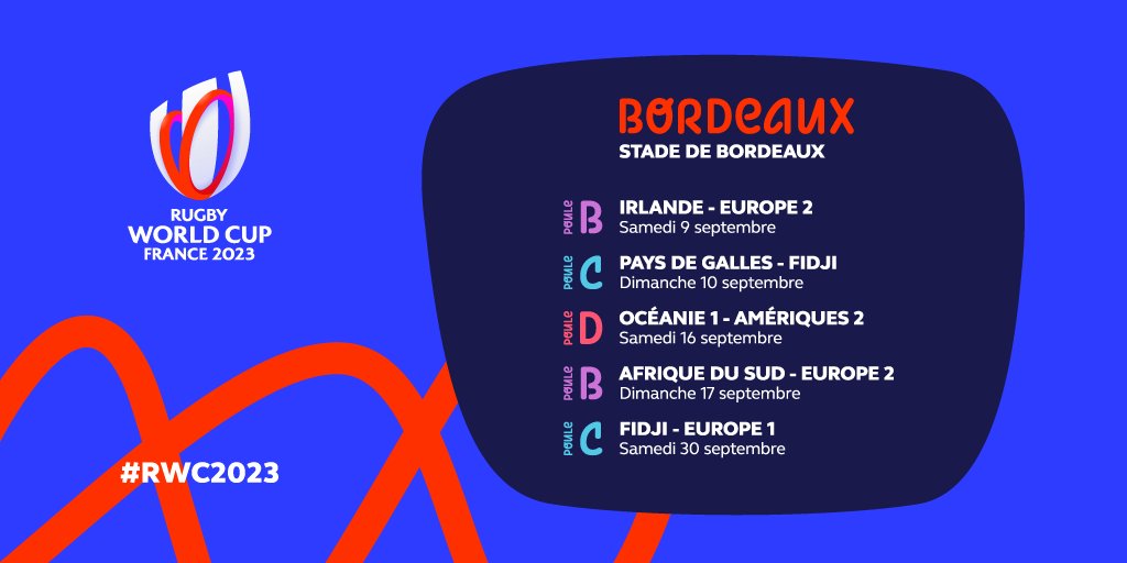 Le comité d'organisation France 2023 et World Rugby ont dévoilé le calendrier des matchs de la Coupe du Monde de Rugby 2023. Bordeaux, en tant que ville-hôte, accueillera 5 matchs de poules au Matmut Atlantique.
