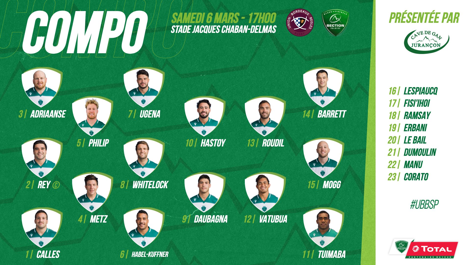 Le staff a dévoilé l'équipe retenue pour affronter la Section Paloise, samedi 6 mars 2021 à 17h00 à Chaban, lors de la 18e journée de Top 14 (Rugby+).