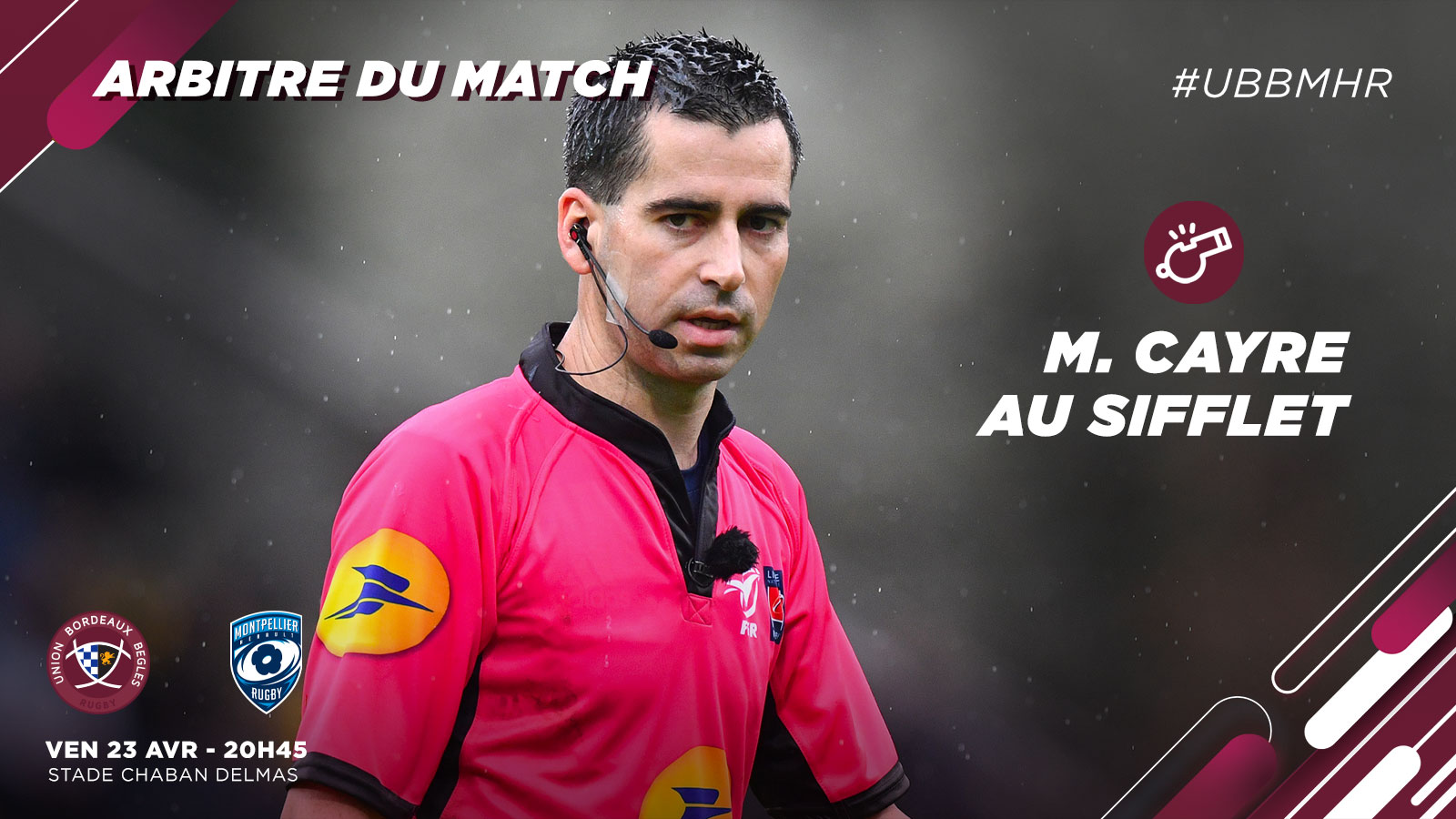 La LNR a dévoilé le corps arbitral désigné pour officier lors de UBB - Montpellier, vendredi 23 avril à 20h45, lors de la 22e journée de Top 14. M. Ludovic Cayre sera au sifflet.