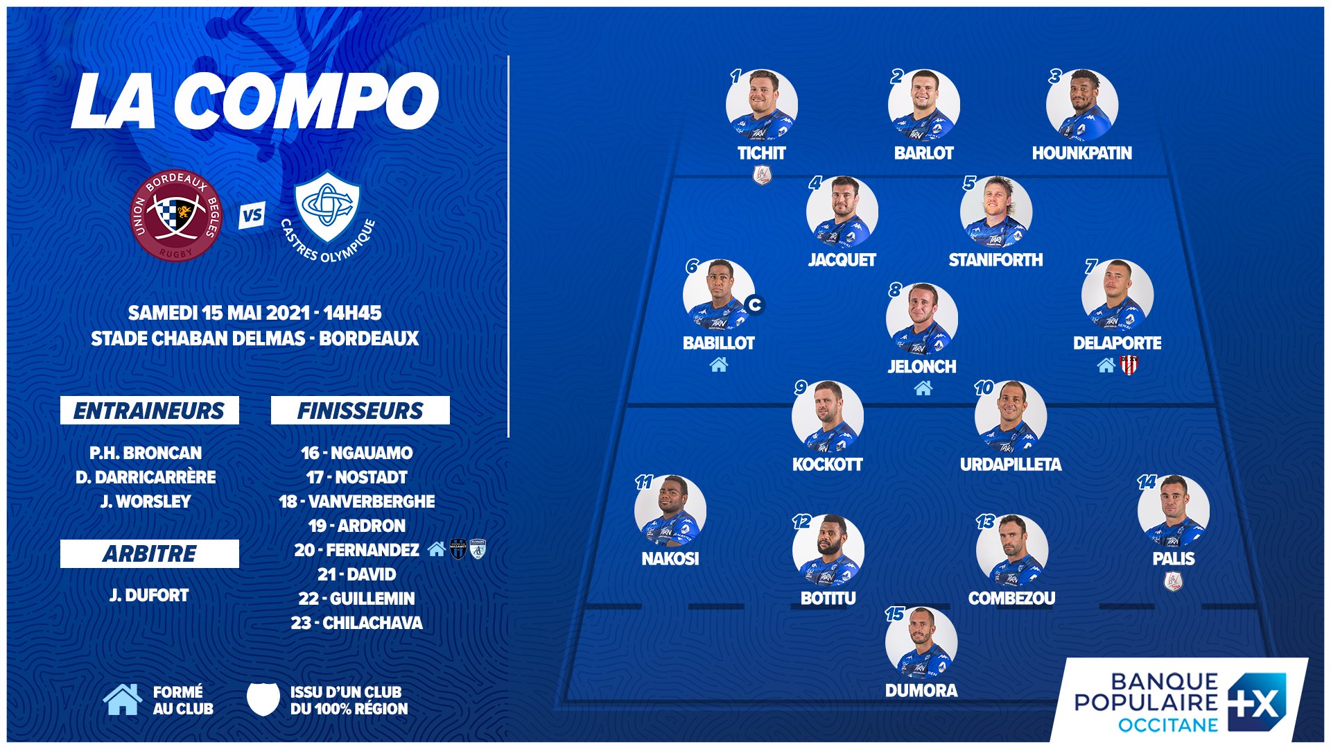 Christophe Urios, Julien Laïrle et Frédéric Charrier ont dévoilé la composition d'équipe de l'UBB pour la réception de Castres, ce samedi 15 mai 2021 à 14h45 à Chaban lors de la 24e journée de Top 14.