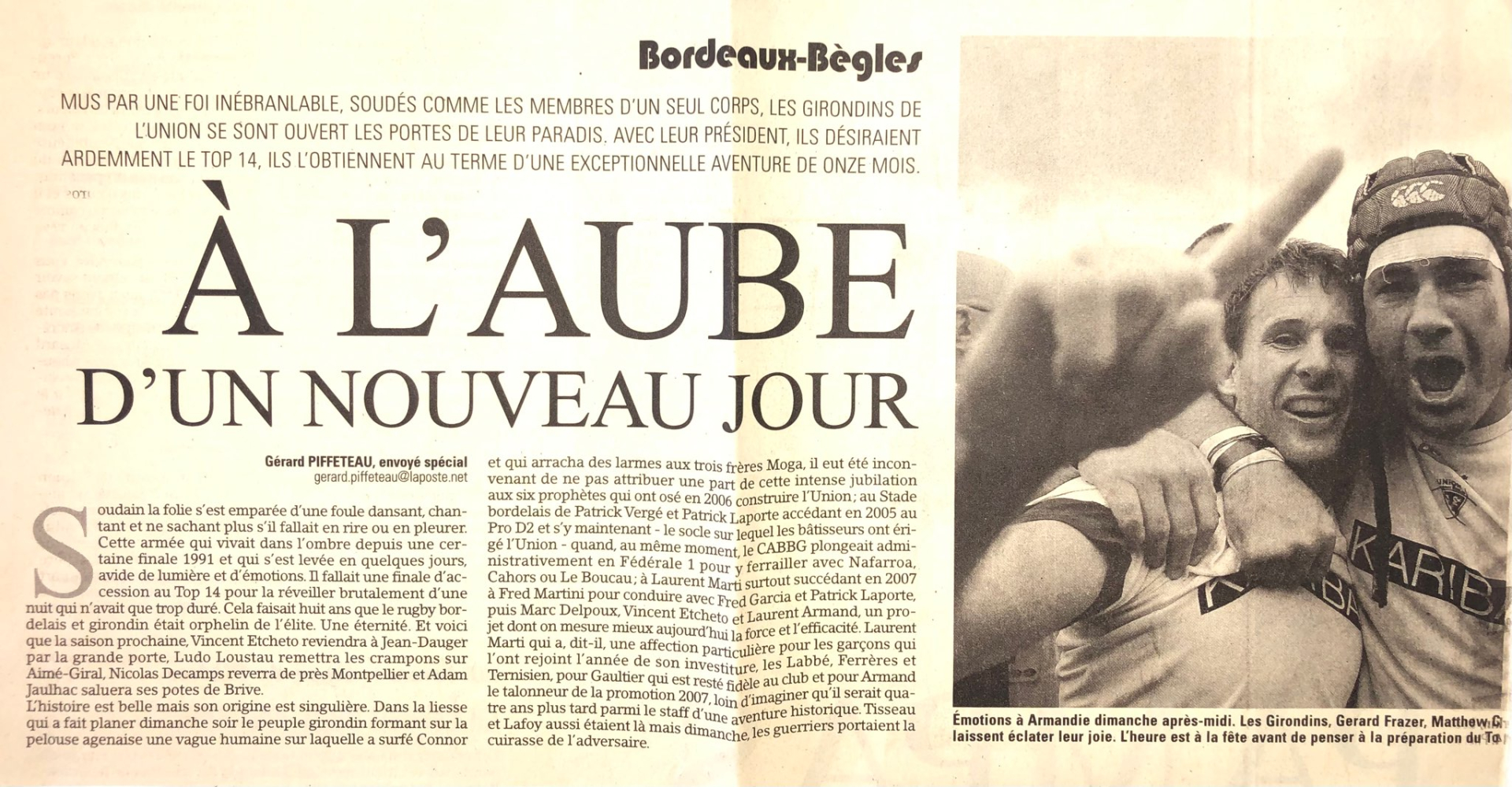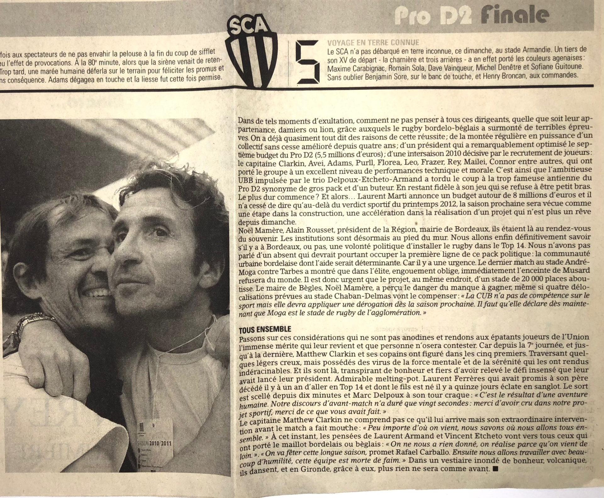 De cette fabuleuse journée je me souviens car j’étais présent sur la zone d’atterrissage du stade Armandie d’Agen. Je peux le prouver, mon vibrant témoignage existe en noir sur jaune dans les pages du Midi Olympique de l’époque (ci-dessous, avec l’aimable autorisation de Midi Olympique NDLR) Neutre et objectif, c’est une question de déontologie, mais intérieurement quel bonheur ! Impressionné par la marée humaine portant son idole Blair Connor vers le ciel, comme une offrande au Dieu rugby, le manager Marc Delpoux - architecte du projet de jeu qui allait séduire le peuple girondin - avait craqué. Payé de son engagement sans faille, le président Laurent Marti pouvait déclarer qu’après la naissance de ses filles, il vivait le plus beau jour de sa jeune existence.