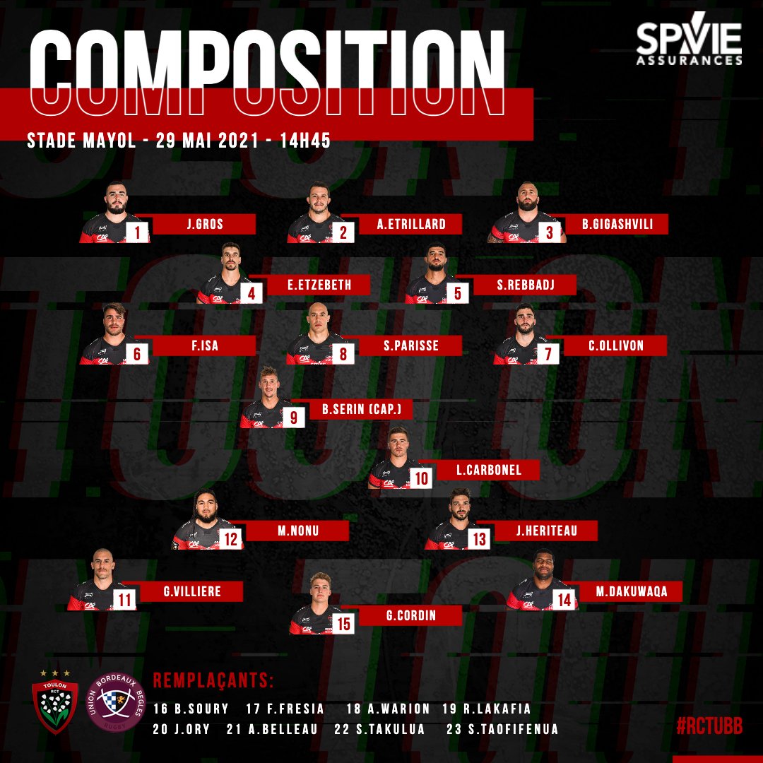 Douze changements ont été opérés au sein du groupe girondin pour affronter le RC Toulon samedi, coup d'envoi à 14h45. À noter, le retour de blessure de Ben Lam et la première titularisation de Thomas Jolmes sous les couleurs de l'UBB. La rencontre sera diffusée sur Canal +.